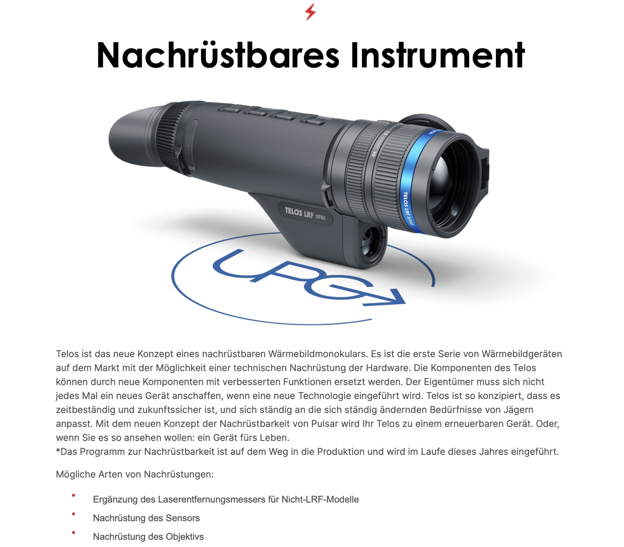 Тelos ist das neue Konzept eines nachrüstbaren Wärmebildmonokulars. Es ist die erste Serie von Wärmebildgeräten auf dem Markt mit der Möglichkeit einer technischen Nachrüstung der Hardware. Die Komponenten des Telos können durch neue Komponenten mit verbesserten Funktionen ersetzt werden. Der Eigentümer muss sich nicht jedes Mal ein neues Gerät anschaffen, wenn eine neue Technologie eingeführt wird. Telos ist so konzipiert, dass es zeitbeständig und zukunftssicher ist, und sich ständig an die sich ständig ändernden Bedürfnisse von Jägern anpasst. Mit dem neuen Konzept der Nachrüstbarkeit von Pulsar wird Ihr Telos zu einem erneuerbaren Gerät. Oder, wenn Sie es so ansehen wollen: ein Gerät fürs Leben.